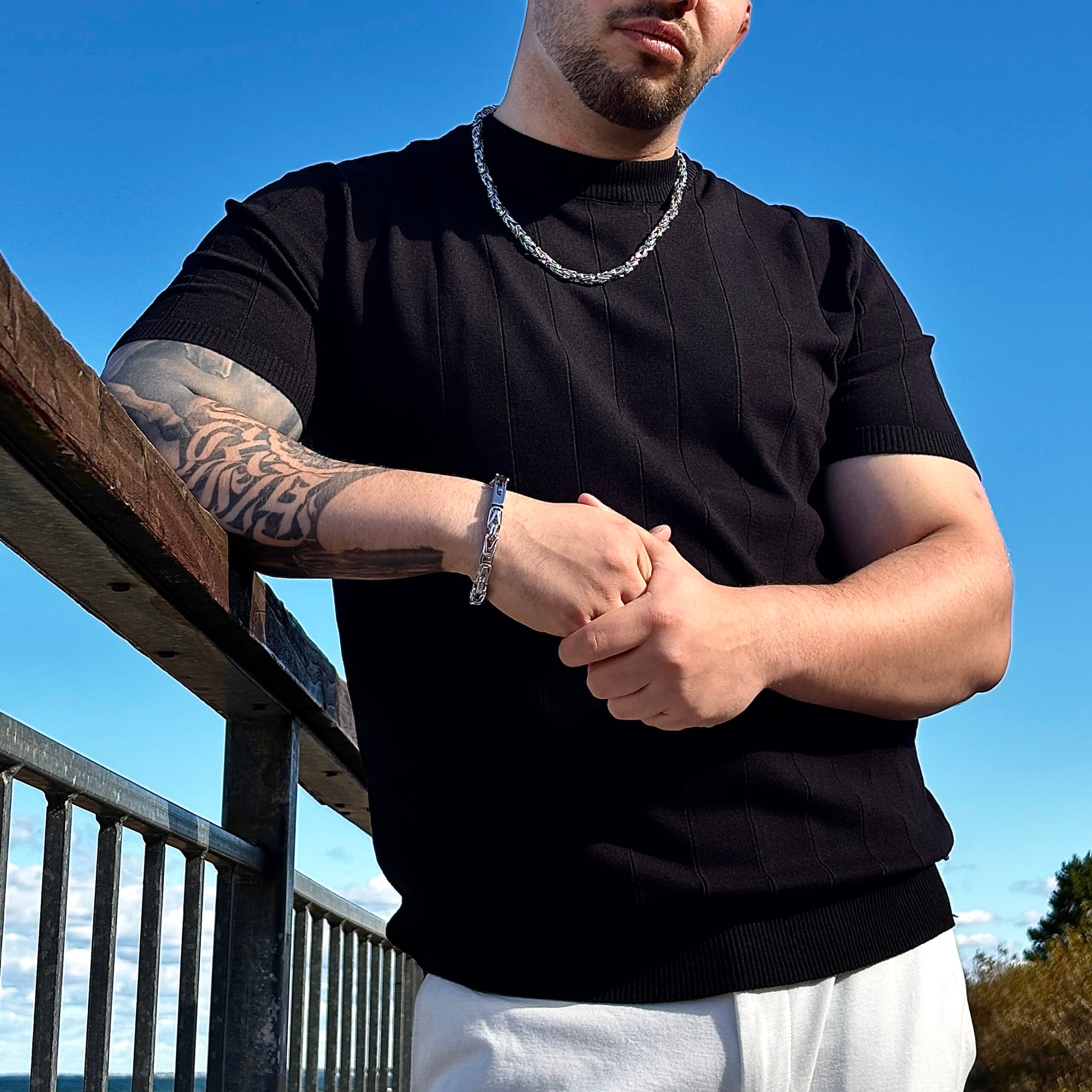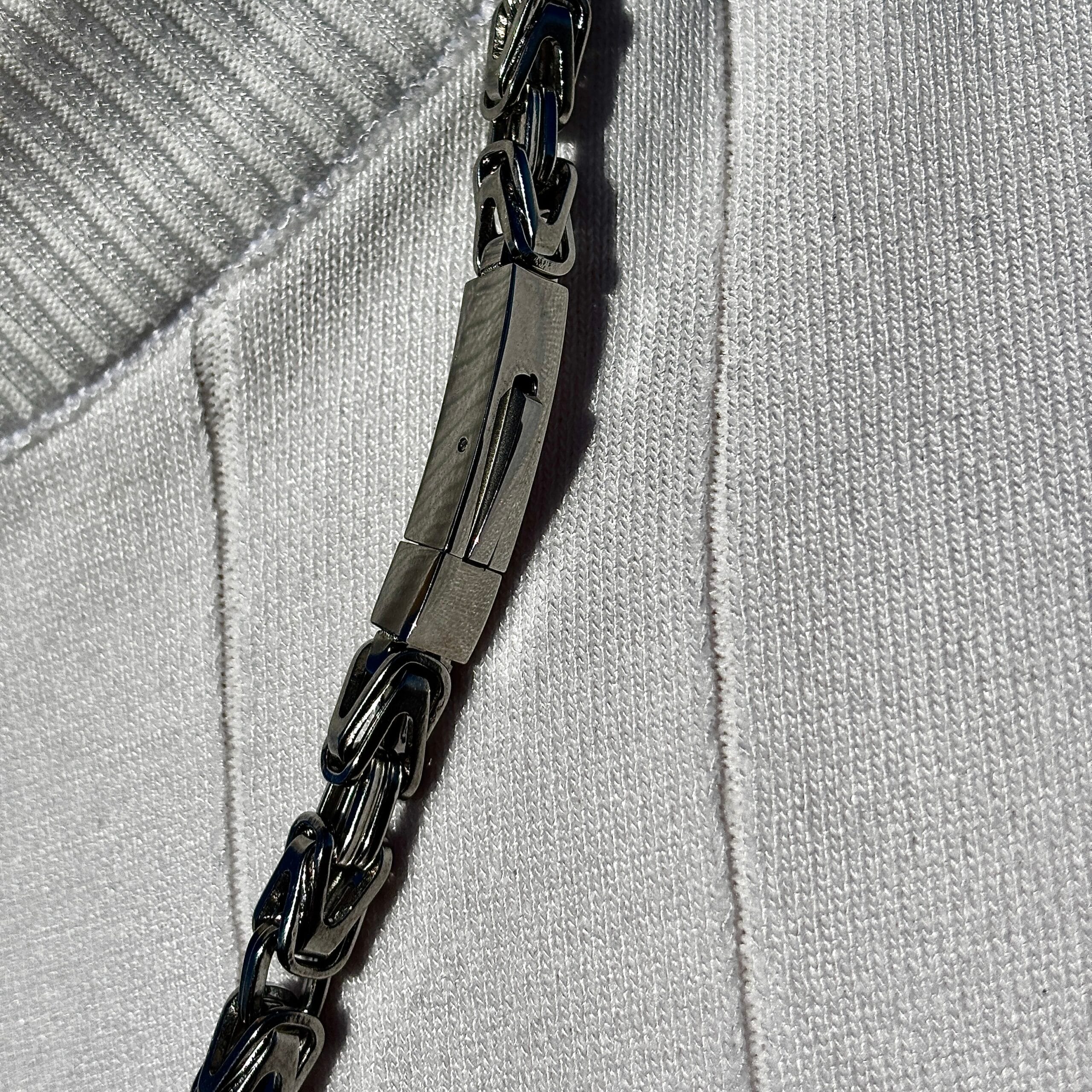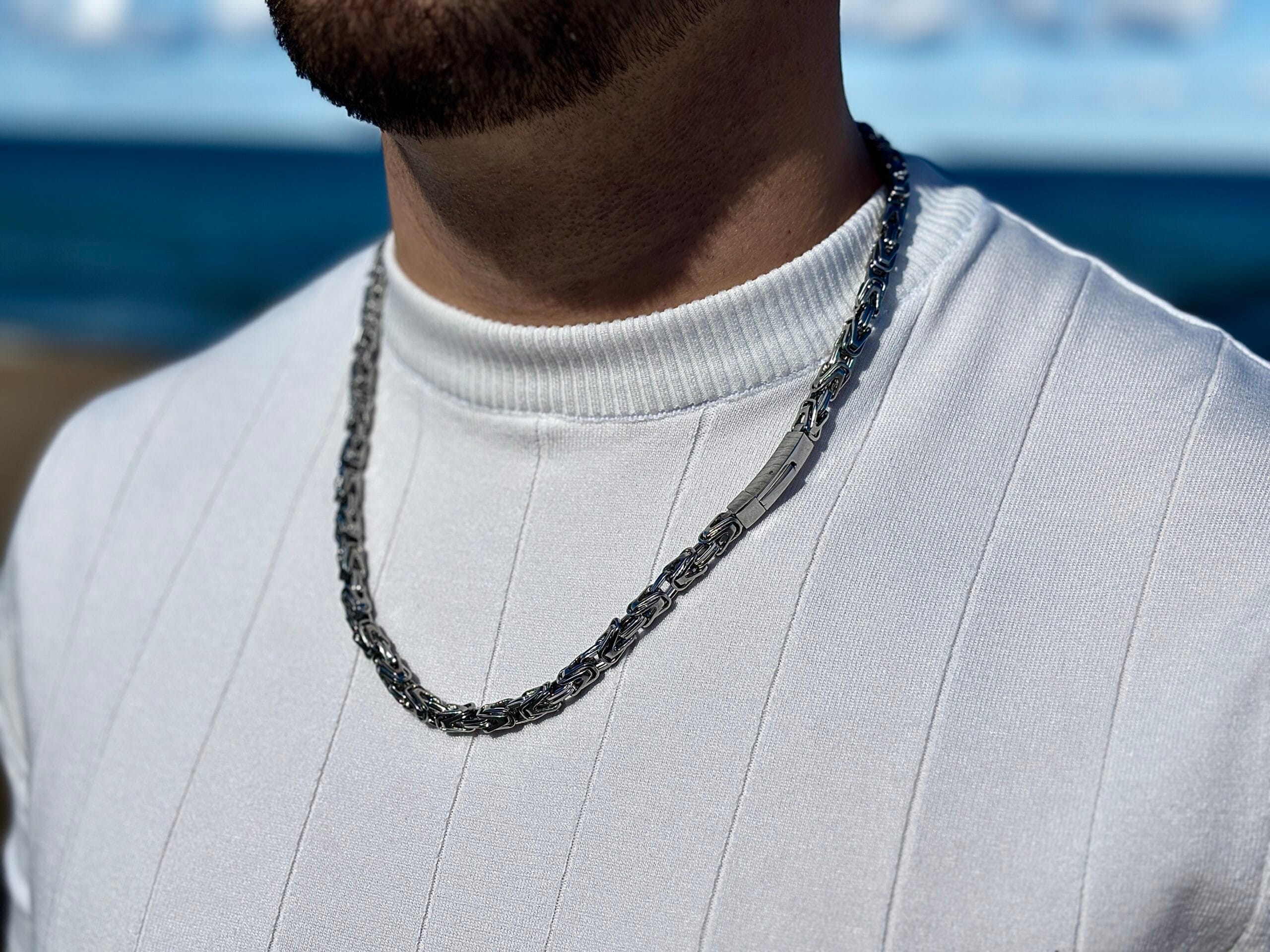 Odpowiednio dobrana biżuteria potrafi całkowicie zdefiniować charakter ubioru. Prezentowany łańcuszek ze stali chirurgicznej to bez wątpienia element mocno przyciągający uwagę otoczenia. Splot królewski zachwyca swoim skomplikowanym, gęstym układem misternych ogniw. Jasna powierzchnia wspaniale pracuje ze światłem podczas każdego Twojego ruchu. Taki model zdecydowanie najlepiej wygląda noszony całkowicie samodzielnie. Masywna konstrukcja sprawia, że łańcuch nie potrzebuje absolutnie żadnych zawieszek do zrobienia genialnego wrażenia. Gotową stylizację warto natomiast uzupełnić dopasowanym detalem na nadgarstek. Zachęcamy do przejrzenia odpowiednich propozycji w kategorii bransoletki.