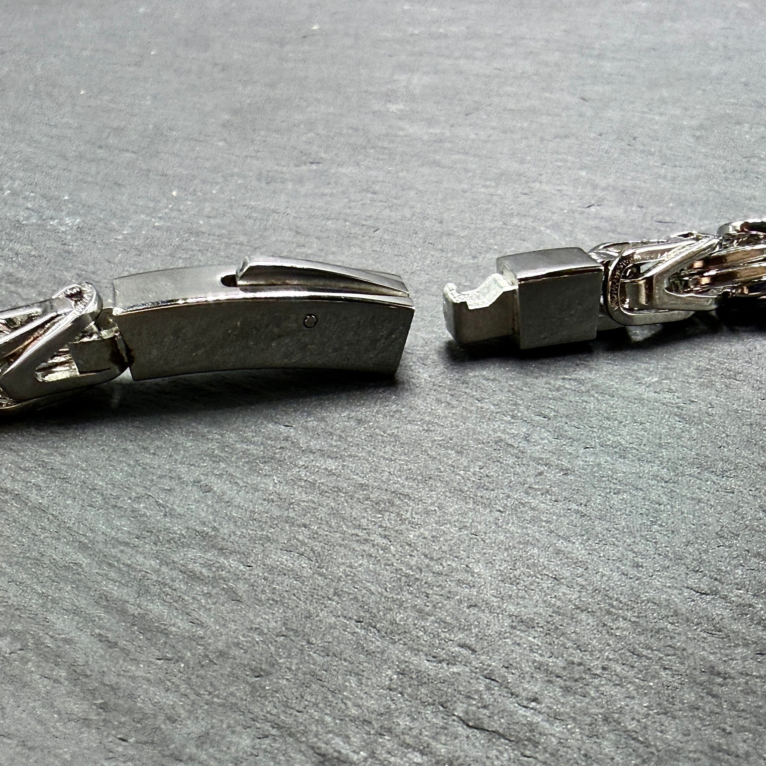 Gabaryty tego projektu zaplanowaliśmy z ogromnym rozmachem. Szerokość na poziomie 6 milimetrów sprawia, że łańcuszek stanowi bardzo wyrazisty punkt stroju. Ciężki i gruby profil wymagał zastosowania odpowiedniego, profesjonalnego systemu zabezpieczającego. Wykorzystaliśmy tutaj niezwykle solidne zapięcie szufladkowe. Mechanizm ten działa na zasadzie wsuwanego elementu, który po zatrzaśnięciu daje absolutną pewność trzymania. Takie rozwiązanie zapobiega przypadkowemu rozpięciu się ozdoby w trakcie intensywnego dnia.