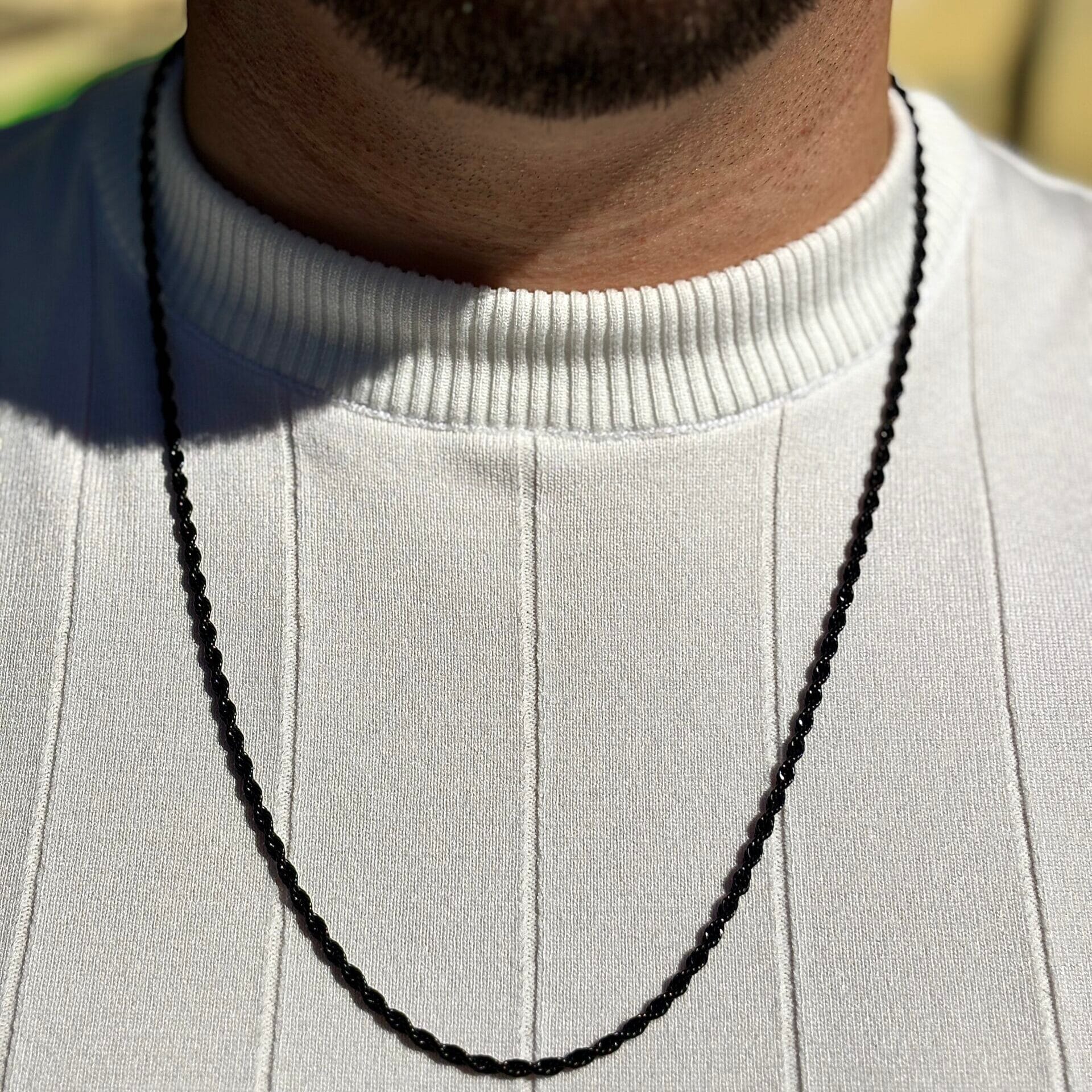 Niesamowita propozycja dla zwolenników tajemniczych i bardzo eleganckich form. Oferowany łańcuszek charakteryzuje się precyzyjnym wzorem typu kordel. Skręcone ogniwa tworzą spójną strukturę przypominającą stylowy sznur. Udostępniamy możliwość wyboru pomiędzy dwiema uniwersalnymi grubościami wynoszącymi 3 milimetry oraz 4 milimetry. Projekt przygotowano w całości z bardzo odpornej stali czarnej. Głęboki odcień metalu genialnie pochłania światło. Sprzedawana biżuteria pozostaje w stu procentach hipoalergiczna dla ludzkiej skóry. Taki nieszablonowy format świetnie sprawdzi się jako baza do noszenia z ulubionymi zawieszkami. Model wygląda równie fascynująco jako w pełni samodzielna ozdoba na dekolcie.