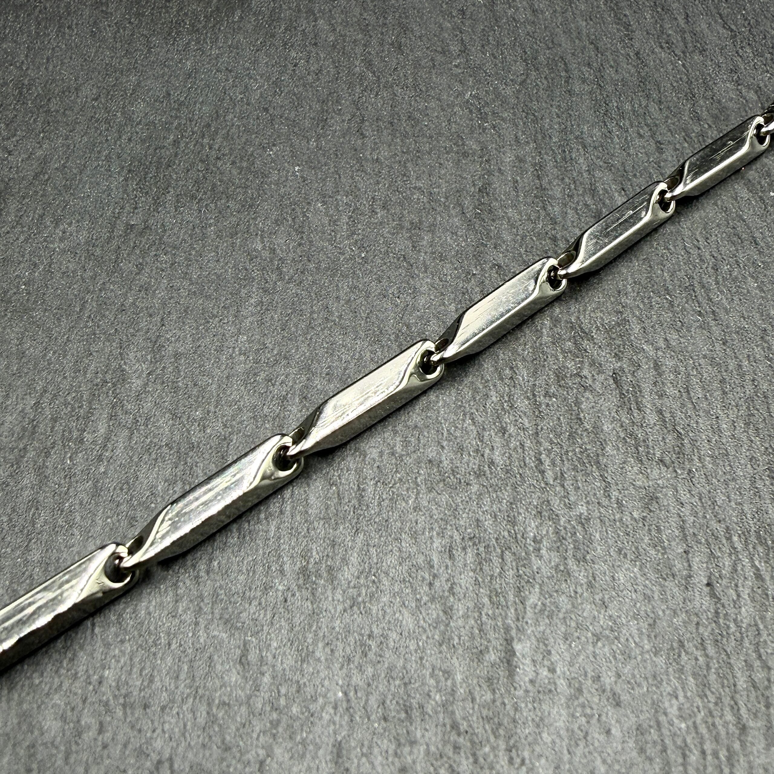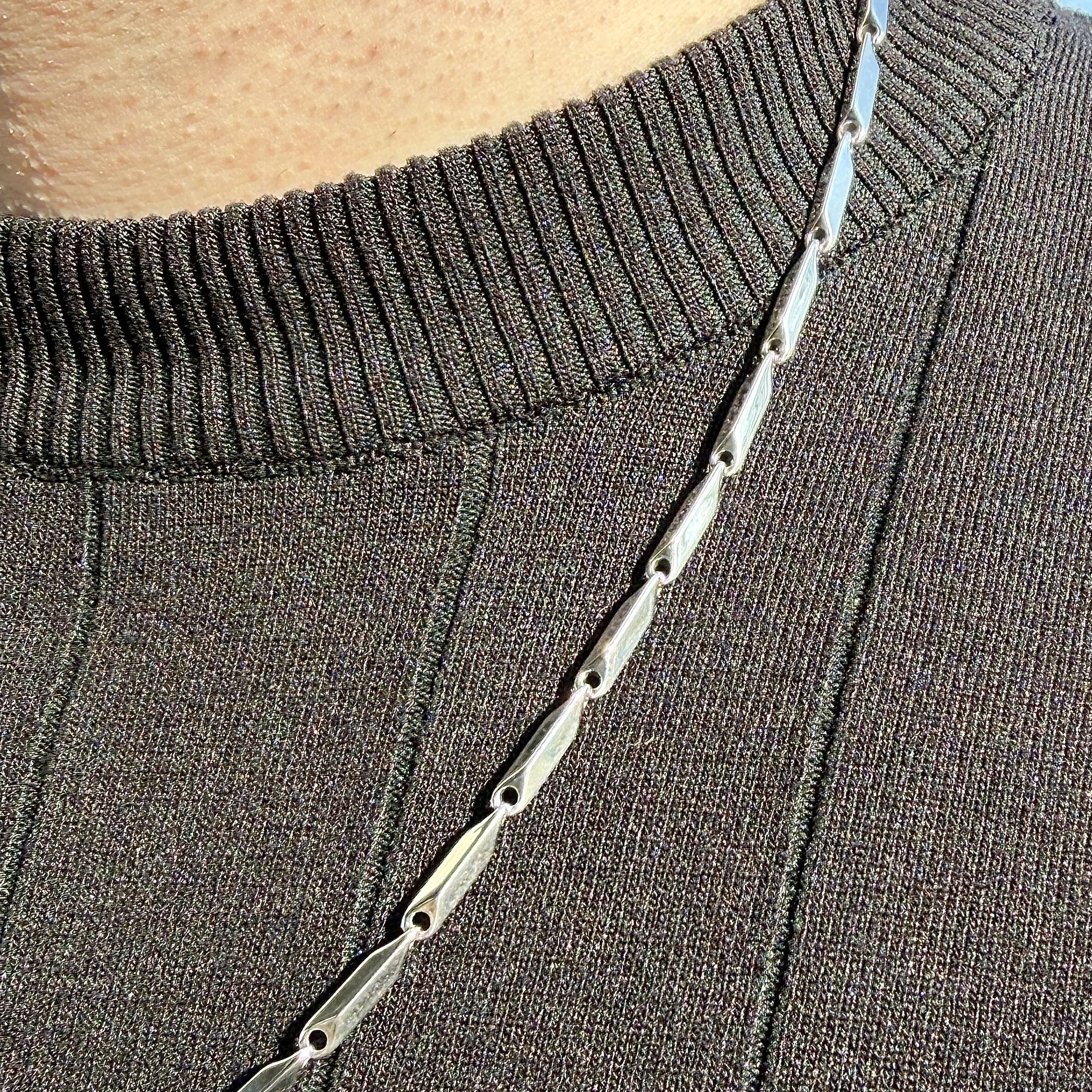 Nieszablonowe detale potrafią całkowicie odmienić charakter codziennego ubioru. Oferowany łańcuszek ze stali chirurgicznej to doskonała propozycja dla poszukiwaczy innowacyjnego wzornictwa. Konstrukcja opiera się na wydłużonych, geometrycznych modułach przypominających niewielkie sztabki. Gładka powierzchnia każdego elementu niesamowicie mocno odbija promienie świetlne. Taki model prezentuje się wyśmienicie bez żadnych dodatków. Świetnym pomysłem będzie również sparowanie go z wyrazistym medalionem. Odpowiednie inspiracje znajdziesz w naszej kategorii zawieszki.