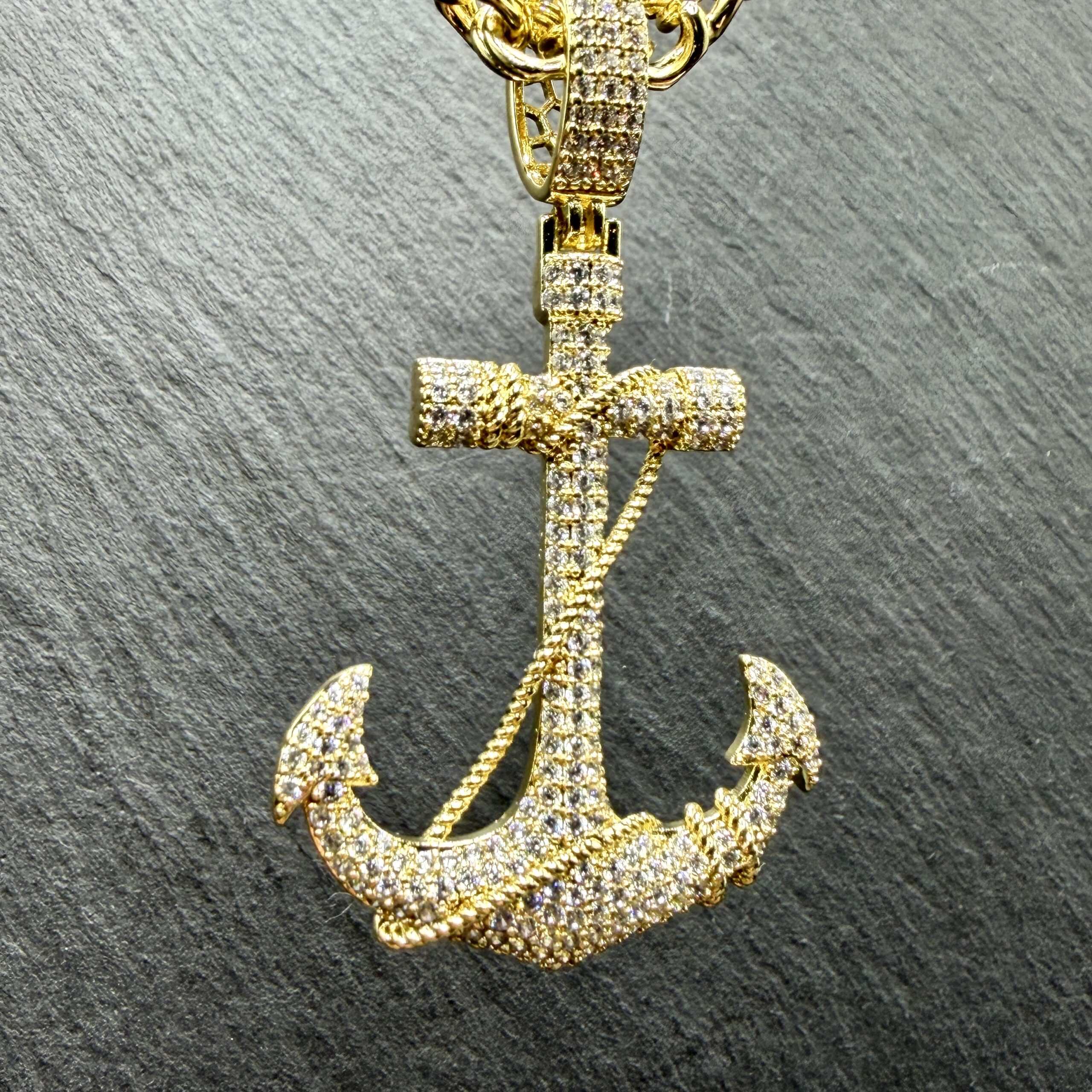 Odpowiednio dopasowane dodatki potrafią nadać niesamowitego charakteru całej garderobie. Prezentowana zawieszka ze stali pozłacanej to bez wątpienia element mocno przykuwający spojrzenia otoczenia. Kształt klasycznej kotwicy zyskał tutaj bardzo luksusowe, bogate wykończenie. Front detalu lśni dzięki wykorzystaniu niesamowitych kamieni LC o szlifie brylantowym. Precyzyjne fasetowanie sprawia, że promienie świetlne wspaniale odbijają się od całej ozdoby. Taki intrygujący projekt wymaga oprawy w postaci równie solidnego splotu. Zachęcamy do przejrzenia dostępnych modeli w kategorii łańcuszki.